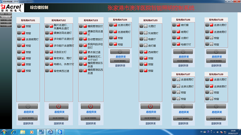 安科瑞智能照明監控系統主要實現張家港澳洋醫院的樓層公共區域的照明回路的遠程控制。該系統總計有51臺ASL100-S4/16,24臺ASL100-S8/16,現場所有智能照明控制模塊采用混合串并聯的方式接在一起,采用KNX總線通訊,從而完成整個醫院的智能照明控制網絡,實現值班室總機的通訊,同時護士站設立區域分控觸摸屏,完成后臺和分控的數據連接。 ??
