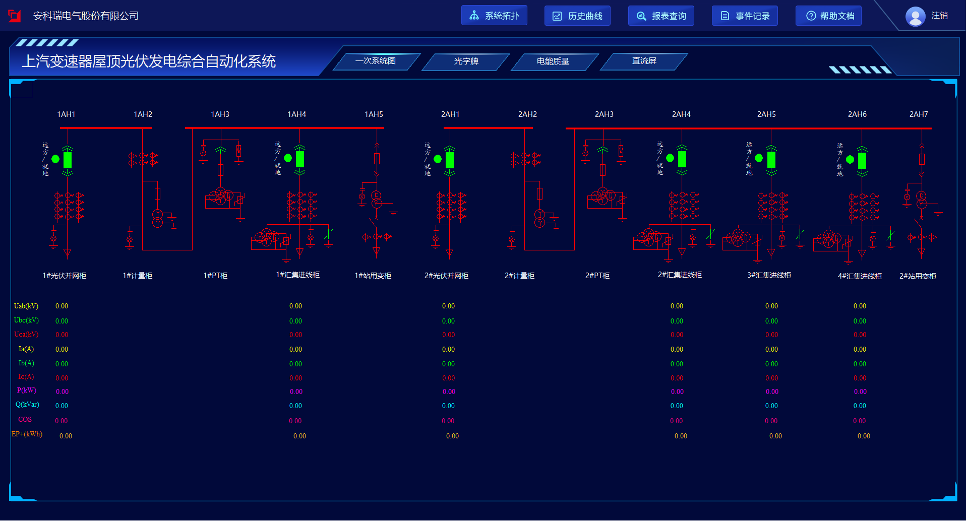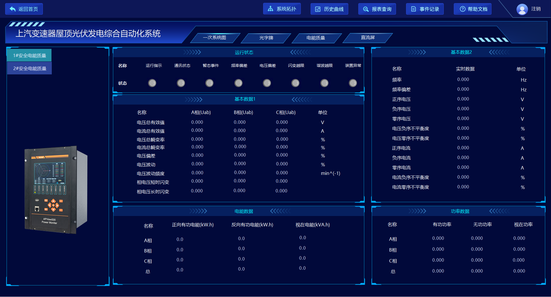 電能質量在線監測裝置采集#1、2#光伏并網接入點的電能質量信息,可以對整個供電系統的電能質量包括穩態狀態和暫態狀態進行持續監測。系統界面實時顯示裝置通信狀態、各監測點的A/B/C相電壓總畸變率、三相電壓不平衡度百分比和正序/負序/零序電壓值、三相電流不平衡度百分比和正序/負序/零序電流值,幫助管理人員實時掌握供電系統電能質量情況,以便及時發現和消除供電不穩定因素。