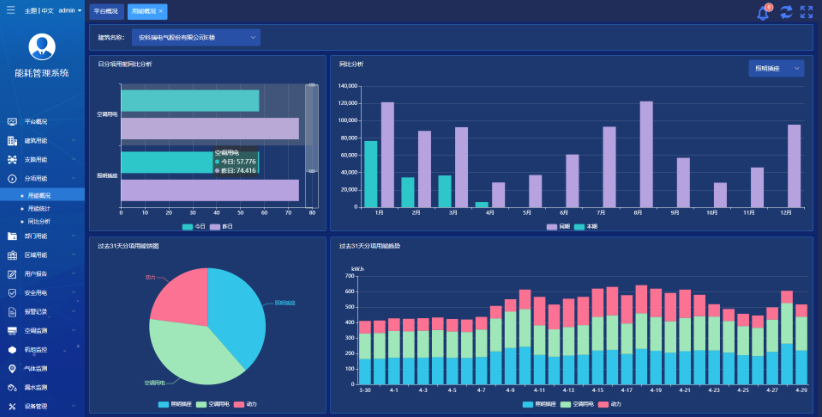 提供能耗分析報(bào)告功能,從多個(gè)維度統(tǒng)計(jì)分析用戶能耗使用情況。報(bào)告可以提供同環(huán)比分析、復(fù)費(fèi)率電量和電費(fèi)分析、能耗排名分析、報(bào)警情 況統(tǒng)計(jì)等功能。